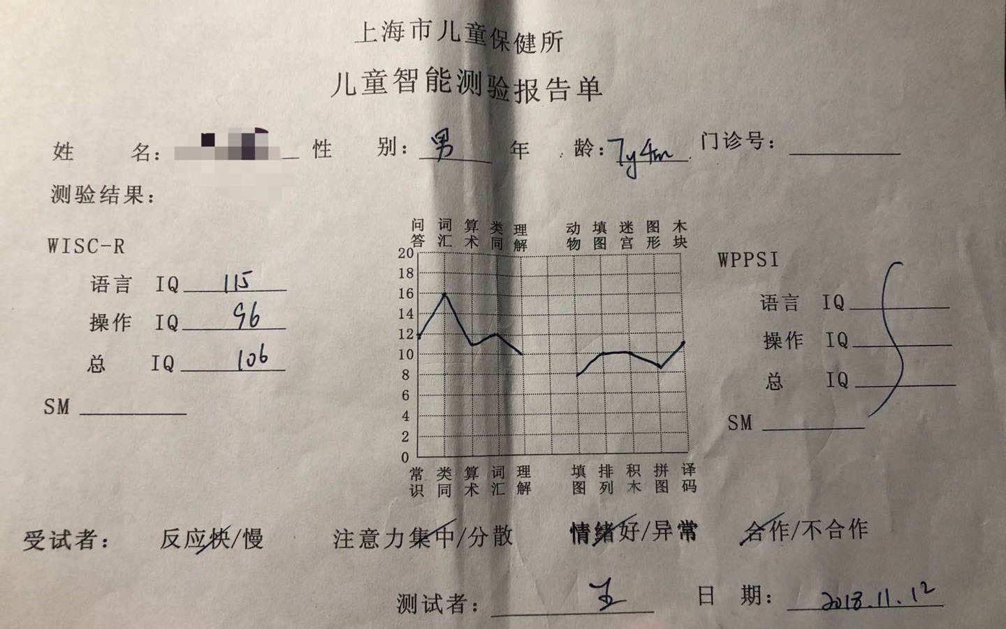 我家小毛现在八岁了,出生时有围产期窒息。 幼儿园阶段:托班-小班 有孤立状态经常一个人不与同学说话 中班-大班 开始活跃起来,话特别多,影响正常学习,大班阶段开始不听老师控制,对奖惩没有明显概念 小学阶段:一年级自理能力低于同学,上课思想不集中,经常开小差,丢三落四,但靠着幼儿园外面培训的底子,学习成绩还算可以。 二年级开始成绩明显下滑,并且出现打架、不停老师控制,经常奔跑,上课站立,自顾自画画,丢三落四更严重,并且在家里面对面学习的时候也发生分心状态,无法集中,导致二年级下班学期成为年底组期中考试倒数第一。 日常习惯:自理能力差、偶尔说谎、活动协调能力差,动不动就哭,一批评就哭,一满足不了就哭,搞得我们父母脾气也控制不住,每次莫名其妙的伤心的哭。 另外平时在上下课路上自顾自看外面的路面和高架道路,完全不理会大人和他的交流(这个从幼儿园开始就这样) 然后我们在小毛7Y4M的时候去上海儿童医院做了检测,但是报告医生分析的不是很完整,只知道现在有多动症和抽动症(从幼儿园中班开始不断的有各种怪动作,眨眼、扭鼻、张嘴、扭脸等等)后来开始用 择思达 目前抽动症基本没有问题了,但是打架、学习、集中力非常成问题,这段时间还每周带小毛去参加感统训练。 报告如下(2018年11月测试的)。请管理员帮忙解析下,并且建议下最近去医院再做一些什么检测。谢谢 ![]() ![]() ![]() ![]() |