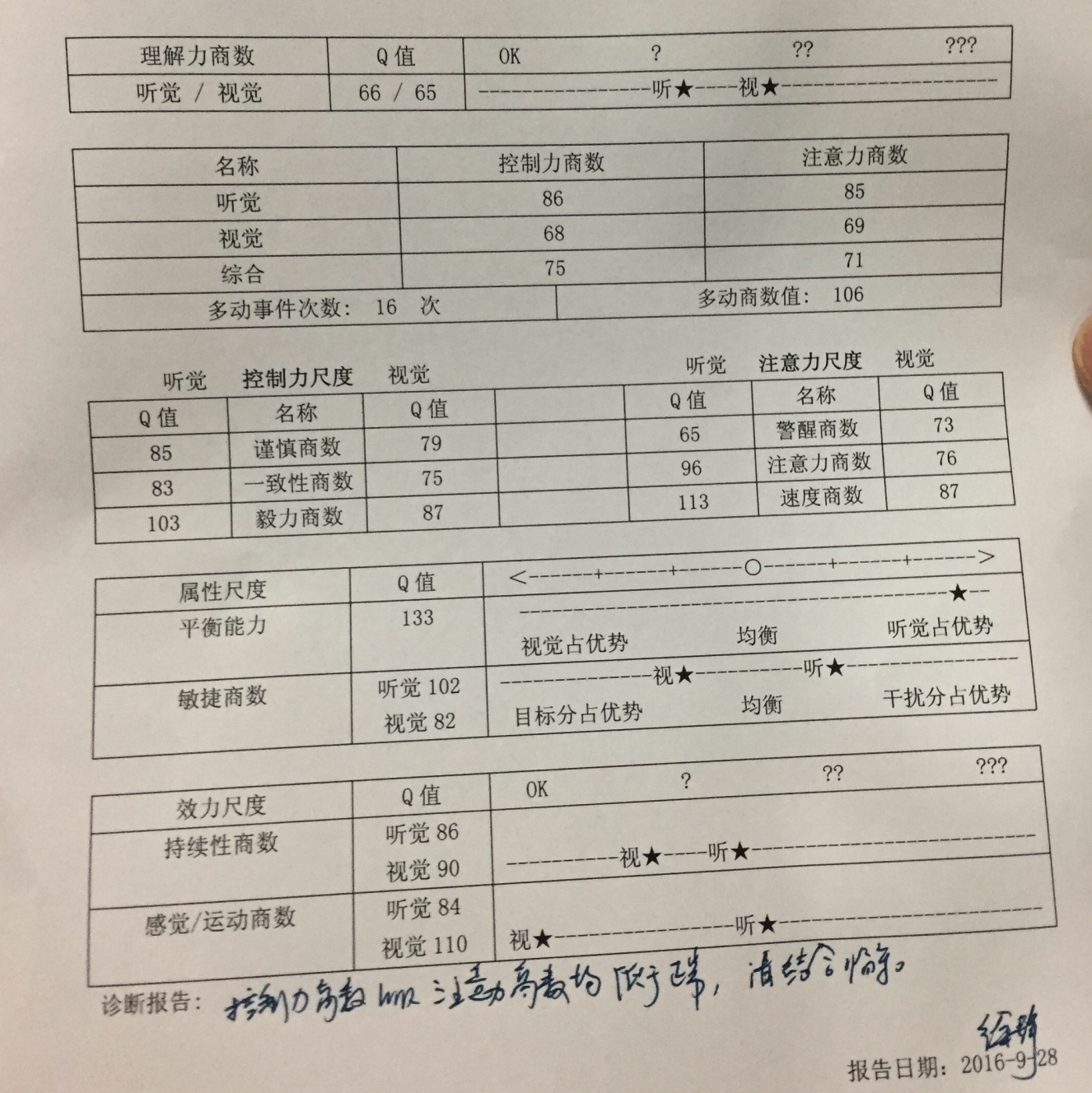 主题: 麻烦哪位专家帮我看一下凭这张视听整合测试报告是否就是多动症发表: 2016/10/09 3:30pm |