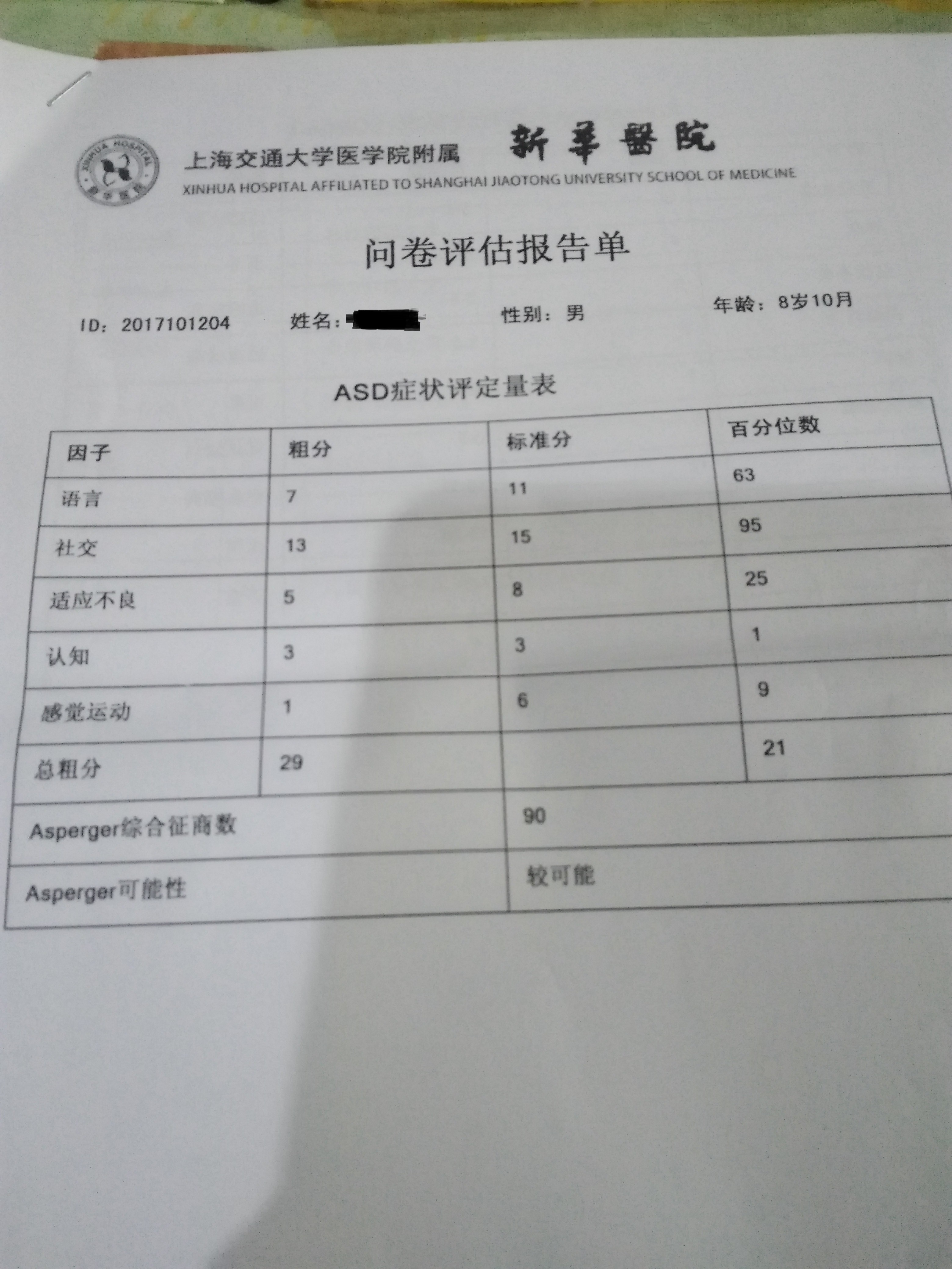 儿子今年快9岁 上小学三年级 上幼儿园时期有不太爱交朋友 做游戏不太爱守规矩 不睡午觉 有时老师讲课时在想别的好玩的事情 就会发笑 当时老师也喜欢他 没在意 以为孩子调皮 长大点就会好点 优点是记忆力特别好 幼儿园时就认识很多字 不认识的字问我下 以后就认识了 歌曲也是听一两遍就会了 对数字也很敏感 几百以内的数学口算很快答出 日历看了几遍阳历的所有节气随便问都可以随时答出 对应的阳历日期也随时答出 是我们家的小日历 对乐高玩具自己不看图纸搭出的造型都很漂亮 对地铁几号线的转换了如指掌 我出行坐车都要问他 上学后 上课不太守规矩 思想不集中 老爱低头想自己的事情 老被老师留下 不是不会做 是太慢课堂作业没写完 回家写作业慢 要家长陪着督促完成 学习成绩还可以 属于上等 和同学玩不到一起 除非特别主动地拉他玩的 玩一会就又自己玩了 没什么朋友 运动能力差 跳绳啊 排球啊 做不了几个 但是小细作方面很好 喜欢手工 很复杂的折纸很快可以折好 最近带他去上海新华医院心理科做个检查 也没具体说什么 说可以家长预约听课 还说可以吃点关注达 我问了说有副作用 说考虑看看 开了点DHA 还说可以吃点维生素B1 回来上网查 找到了这里 看到很多吃药的反应有副作用 检查结果如下